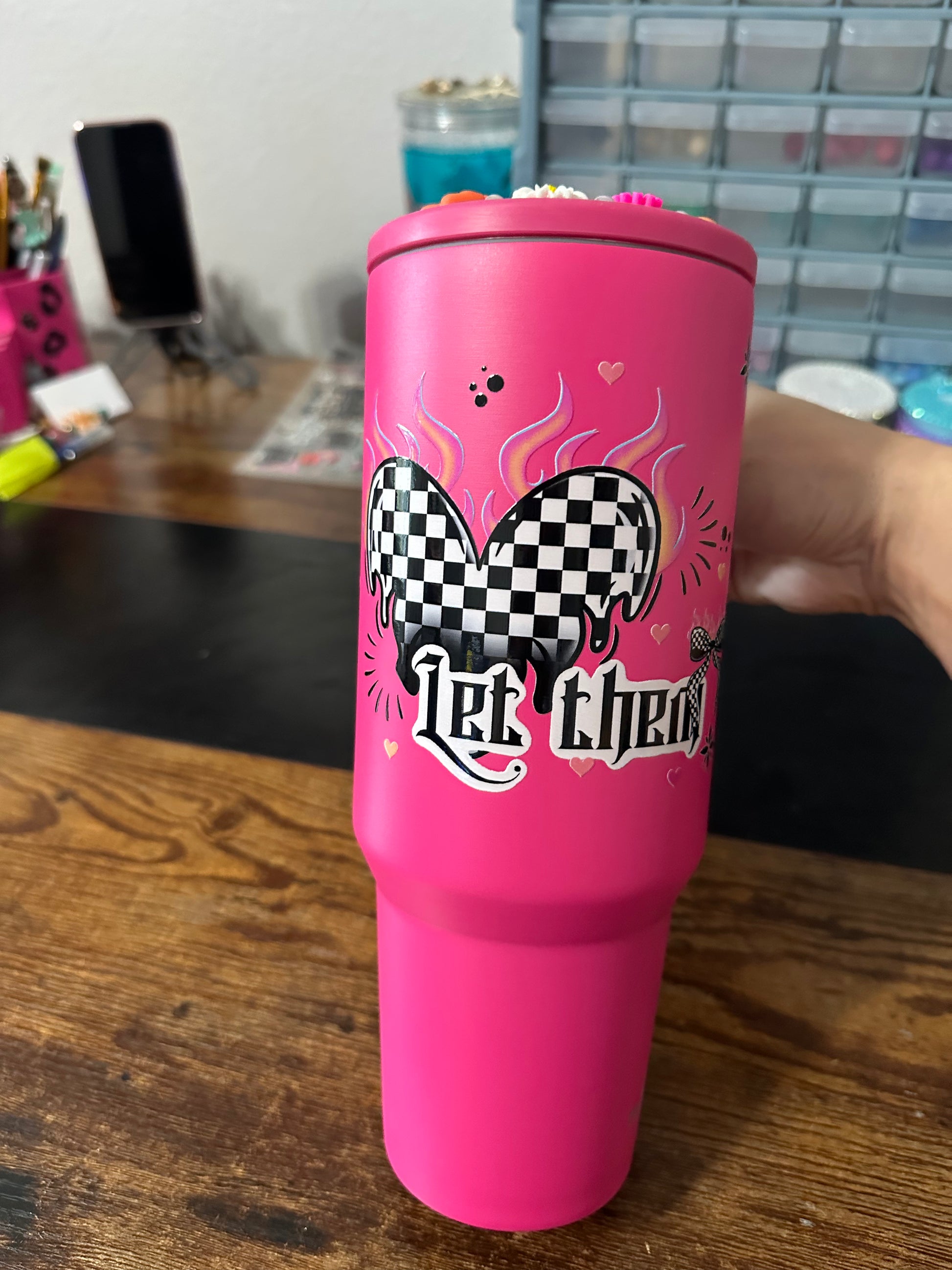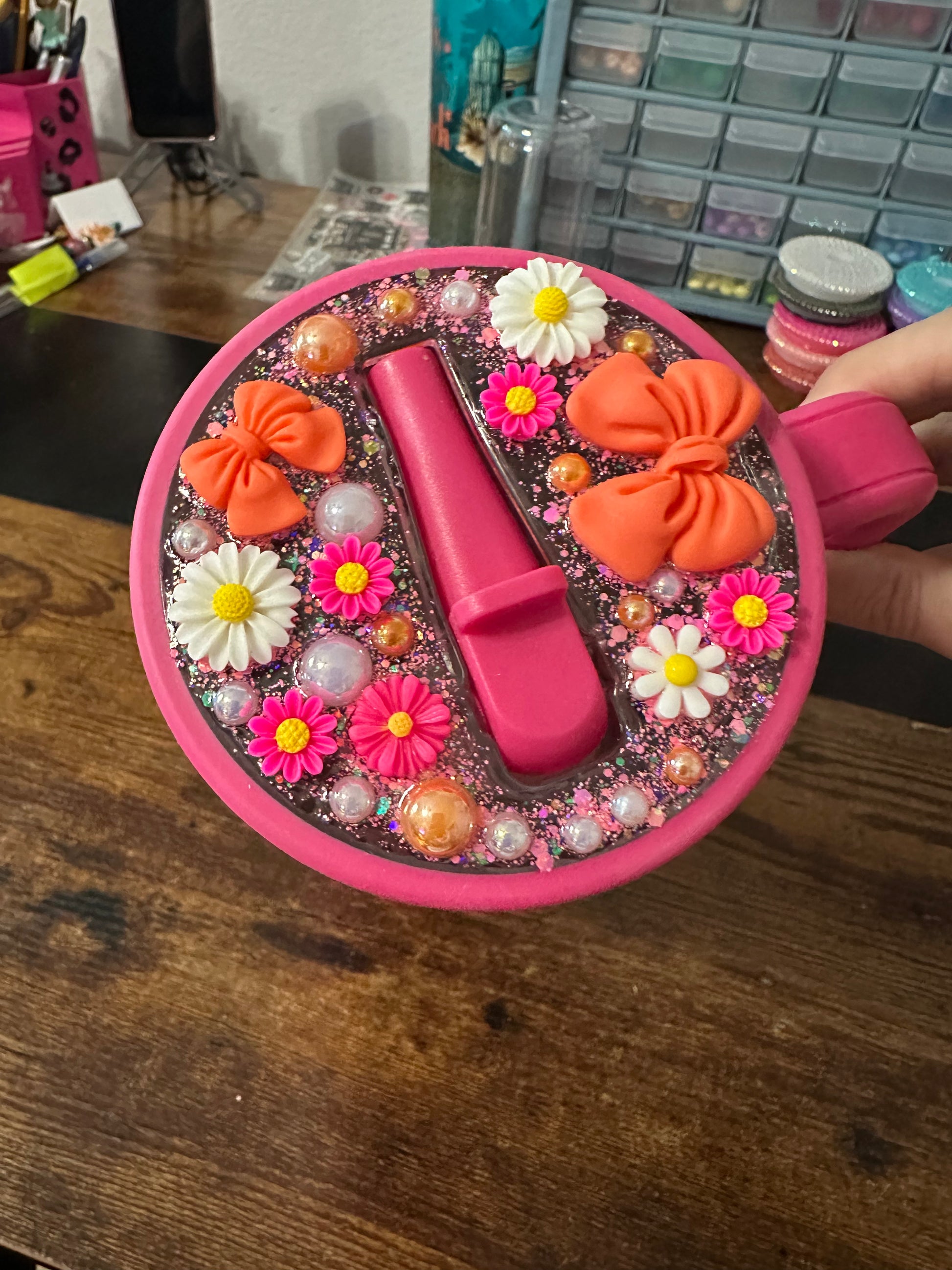 40 oz stainless steel tumbler. Decorated lid and handle charm.
